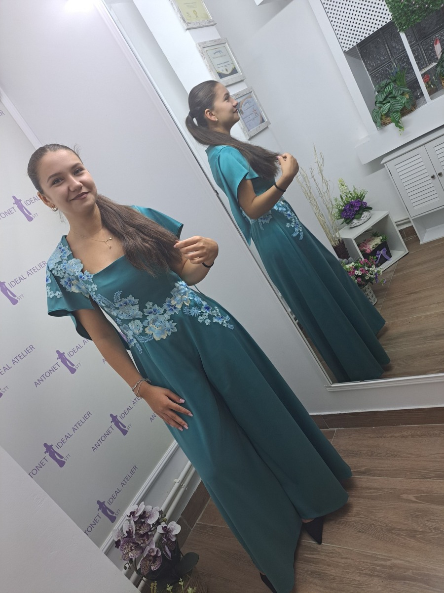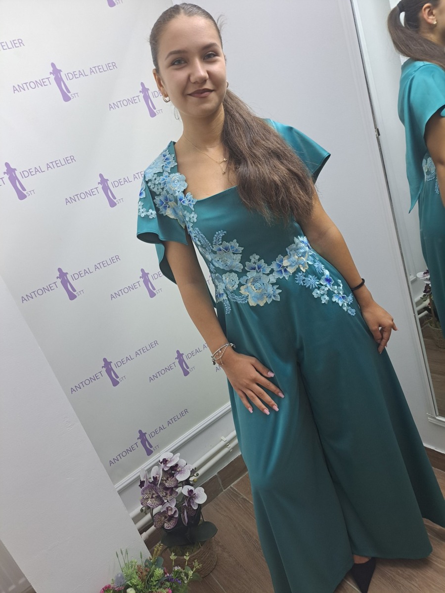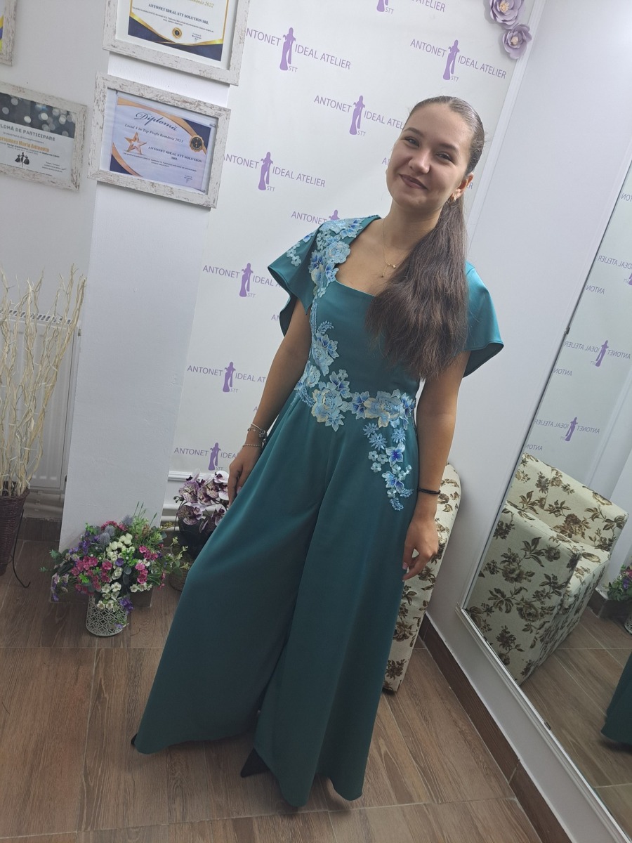 Salopeta este realizata din tafta  de culoare verde turqoaze, accesorizata cu flori din dantela aplicata